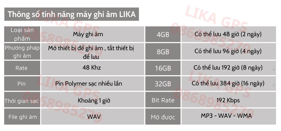- Chống thấm nước chuẩn IPX6, không được ngâm trong nước thời gian dài, ghi âm liên tục 20-25 ngày.